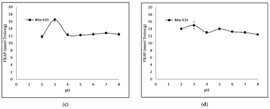 Effect of pH (2.0–8.0) on ferric-reducing antioxidant power of KGMHs of different molecular weights. (a) Mw = 9212, (b) Mw = 4342, (c) Mw = 629 ad (d) Mw = 419.