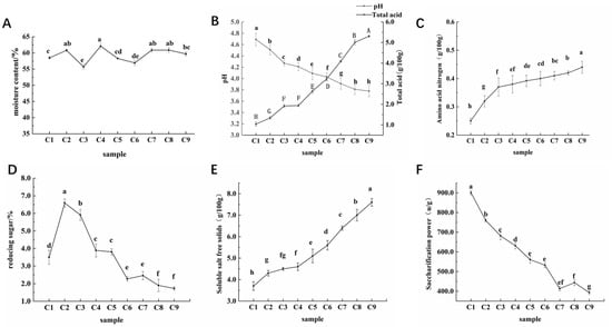 Measurement results of physicochemical parameters during the fermentation of aged vinegar: (A) moisture content, (B) pH and total acid, (C) amino acid nitrogen, (D) reducing sugar, (E) soluble salt-free solids, and (F) saccharification power. Note: The Cuqu (C0) was set as group R1, the alcoholic fermentation stage (C1–C4) as group R2, and the acetic acid fermentation stage (C5–C9) as group R3. A–H: indicates significant difference; a–h: indicates significant difference.