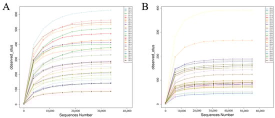 After testing the purity and concentration of DNA, using genomic DNA as a template, PCR amplification was performed using primers 341F (5′-GCTACGGGNGGWGCAG-3′)/805R (5′-GATACHVGGGTATCTAATCC-3′) and 1737F (5′-GAAGTAAAAGTCGTAACAG-3′)/2043R (5′-GCTGTGTTCATCGATGC-3′) to amplify the gene sequences of bacterial 16S rDNA V3–V4 region and fungal ITS1 region, respectively. The PCR amplification system had a volume of 30 μL, consisting of the following components: 15 µL of Phusion Master Mix (2×), 3 µL of primer (2 µmol/L), 10 µL of gDNA (1 ng/µL), and 2 µL of ddH2O. The reaction procedure involved the following steps: pre-denaturation at 98 °C for 1 min, followed by 30 cycles of denaturation at 98 °C for 10 s, annealing at 50 °C for 30 s, and extension at 72 °C for 30 s; there was a final extension at 72 °C for 5 min. After amplification, 2% agarose gel electrophoresis was used for detection, and the product was retrieved using the GeneJET gel recovery kit which form Beijing Jiahang Bochuang Technology Co., Ltd. (Beijing, China). The qualified amplification products underwent high-throughput sequencing on an Illumina NovaSeq 6000 platform of Beijing Nuohe Zhiyuan Technology Co., Ltd. (Beijing, China).