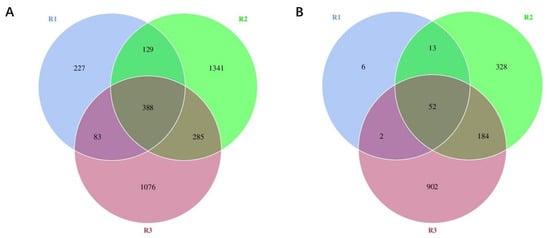 Cuqu (C0) was set as group R1, the alcohol fermentation stage (C1–C4) as group R2, and the acetic acid fermentation stage (C5–C9) as group R3. Figure 3 illustrates that 3529 bacterial OTUs were identified in the Cuqu and vinegar mash samples. The number of bacterial OTUs among different stages was as follows: R1 (827) < R3 (1832) < R2 (2143), with 388 bacterial OTUs detected across the three stages. Among these, the number of bacterial OTUs in R2 reached more than twice that of R1, which might be due to the addition of additional raw materials during alcohol fermentation, thereby introducing new strains [25]. Additionally, the number of bacterial OTUs in the R2 group was the largest, indicating the most abundant types of bacteria involved during the alcohol fermentation stage. It could be due to some microorganisms gradually adapting to the fermentation environment and continuously enriching, reaching the detection threshold for high-throughput sequencing. Further, 1487 fungal OTUs were detected during the entire fermentation process, with R1 (73) < R2 (577) < R3 (1140) at different stages. The total number of fungal OTUs in the three stages was 52. R3 exhibited the highest number of OTUs.