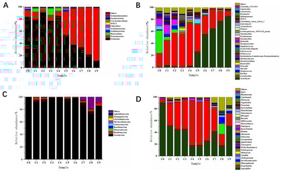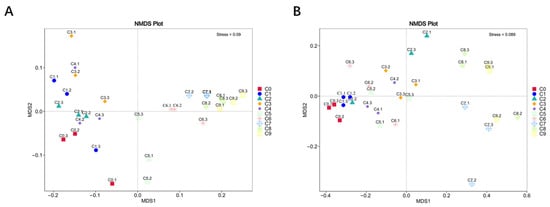 Beta diversity was used to characterize the compositional differences between different samples. NMDS analysis was considered to reflect the differences in microbial community structure among the different samples. The analysis results are shown in Figure 5, with bacterial and fungal stress values of 0.09 and 0.089, respectively. This indicated a significant separation among the 10 samples, suggesting significant differences in bacterial and fungal microbial communities between each sample. As shown in Figure 5A, the four samples from the alcohol fermentation stage (C1–C4) were positioned in the second and third quadrants, while the five samples from the acetic acid fermentation stage (C5–C9) were located in the first and fourth quadrants, indicating differences in bacterial community structure between the two stages. The parallel samples within the bacterial and fungal groups were also widely dispersed, possibly due to uneven sampling.