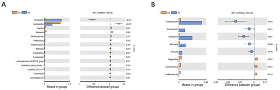t test analysis of microbial community structure of (A) bacteria and (B) fungi.