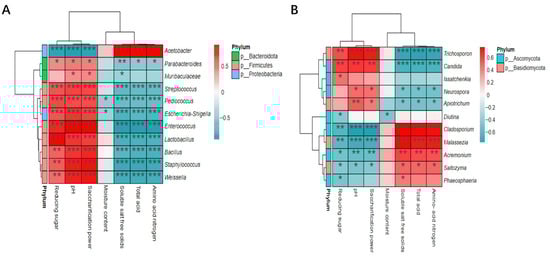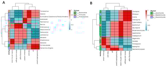 Correlation heat map analysis of physicochemical parameters and microorganisms in fermentation process: (A) bacterial and (B) fungi (*** p < 0.001; ** p < 0.01; * p < 0.05).