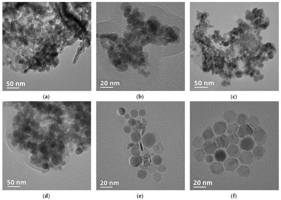 Transmission electron microscopy of NaGdF4 at different temperatures and times. (a) 1 h, 300 °C; (b) 1.5 h, 300 °C; (c) 2 h, 300 °C; (d) 1 h, 310 °C; (e) 1.5 h, 310 °C; (f) 2 h, 310 °C.
