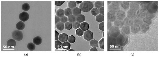 Transmission electron microscopy pictures of (a) NaGdF4 @ NaGdF4: Yb, Tm; (b) NaGdF4 @ NaGdF4: Yb, Tm @ NaGdF4: Yb, Nd; (c) NaGdF4 @ NaGdF4: Yb, Tm @ NaGdF4: Yb, Nd @ SiO2 @ NH2.