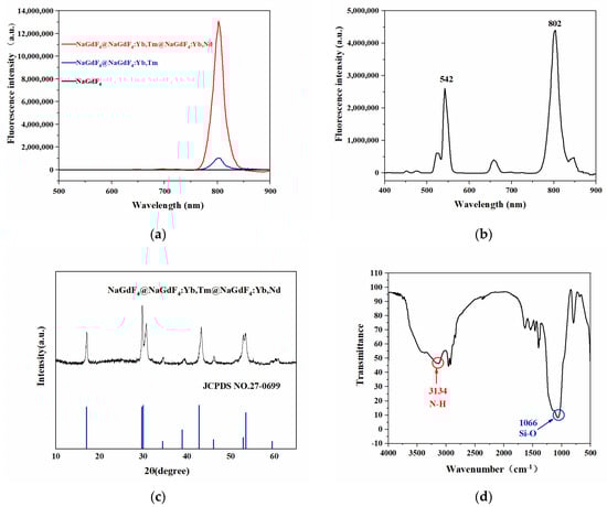 (a) NaGdF4@NaGdF4: Yb, Tm@NaGdF4: Yb, Nd fluorescence spectra. (b) Mixed fluorescence spectra of NaGdF4@NaGdF4: Yb, Tm@NaGdF4: Yb, Nd and NaYF4@NaYF4: Yb, Er@NaYF4. (c) NaGdF4 @ NaGdF4: Yb, Tm @ NaGdF4: Yb, Nd X-ray diffraction pattern. (d) Fourier transform infrared spectra of NaGdF4 @ NaGdF4: Yb, Tm @ NaGdF4: Yb, Nd @ SiO2 @ NH2.