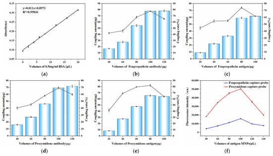 Since the amount of antigen and antibody added will affect the binding amount of the capture probe and the signal probe and the sensitivity of the method, during the preparation of the probe, the BCA kit was used to determine the concentration of the uncoupled antigen (antibody) in the supernatant, and the coupling amount and coupling rate were calculated to optimize the amount of antigen and antibody added to the probe. As shown in Figure 4b, the addition amount of fixed modified UCNPs is 10 mg. When the addition amount of fenpropathrin antibody is 40–100 µg, the coupling amount and coupling rate increase with the increase of antibody addition amount. When the addition amount is 100 µg, the coupling rate of antibody and UCNPs reaches the maximum value. As we continued to increase the addition amount of antibody, the coupling amount did not increase, and the coupling rate decreased, indicating that the binding site of UCNPs had reached saturation. From the perspective of saving antibodies, 100 µg of fenpropathrin antibody was chosen as the optimal addition amount for the preparation of signal probe, at which time the coupling rate was 77.56%. As shown in Figure 4c, the addition amount of fixed MNPs was 2 mL, and the highest coupling rate of 73.9% was achieved when the addition amount of fenpropathrin antigen was 80 µg. Similarly, according to Figure 4d,e, the optimal addition amount of procymidone antibody was finally determined to be 10 µg with a coupling rate of 69.32%, and the optimal addition amount of procymidone antigen was 80 µg with a coupling rate of 81.96%.