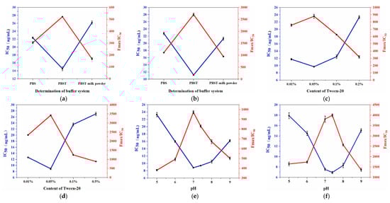 It is possible to determine the optimal competitive reaction system by comparing the IC50 value and Fmax/IC50 value. First, the best buffer system is selected, as shown in Figure 5a,b. When PBST solution is used as the buffer system, the IC50 value is the lowest and the Fmax/IC50 value is the highest. Compared with the other two buffer systems, the sensitivity is higher, so PBST is selected as the buffer system to continue optimization. PBST solution is mainly a mixed system of PBS and Tween-20, and a certain amount of Tween-20 can help to reduce nonspecific adsorption in the reaction, but too much of it can affect antigen-antibody binding [24]. According to Figure 5c,d, with the increase of Tween-20 content, IC50 decreased first and then increased. When the Tween-20 content was 0.05%, the IC50 value was the lowest, and the Fmax/IC50 value was the highest. Therefore, the Tween-20 content in the PBST solution was 0.05%. As shown in Figure 5e,f, IC50 decreased first and then increased with the increase of pH value. When the pH value was 7–7.4, the IC50 values of the two pesticides were lower, and the Fmax/IC50 value was higher. Therefore, the pH value of the control system in the competitive reaction was between 7 and 7.4. Methanol content in the buffer system affects the binding of chemical bonds between antigens and antibodies. When the methanol content is 2.5%, the IC50 value is the lowest and the Fmax/IC50 value is the highest. Therefore, the buffer system was determined to be a PBST solution with a Tween content of 0.05%, a methanol content of 2.5%, and a pH value of 7–7.4. The reaction time will affect the binding of antigens and antibodies, thereby affecting the fluorescence value of the reaction results. When the competitive reaction lasts for 1 h, the fluorescence value of the reaction system is the highest and the reaction effect is the best.