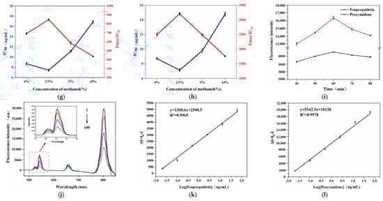 (a,b) Determination of buffer system. (c,d) Tween−20 content. (e,f) pH value. (g,h) Methanol content. (i) Time. (j) Upconversion fluorescence spectra of different concentrations of fenpropathrin and procymidone standards. (k) Standard curve of fenpropathrin. (l) Standard curve of procymidone.