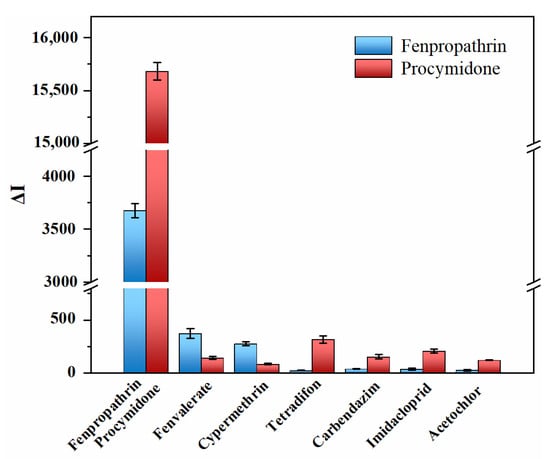 To evaluate the specificity of the method, some structural analogues of fenpropathrin and procymidone and other common pesticides, namely fenvalerate, cypermethrin, dicofol, carbendazim, imidacloprid, and acetochlor, were selected for cross-reaction experiments. The concentration of each standard was 10 µg/L. According to the immunoassay established in this experiment, the capture probe and the signal probe were added in turn. The fluorescence values at the emission wavelengths of 542 nm and 802 nm after the reaction were recorded as I and the fluorescence values after the reaction of only the capture probe and the signal probe were recorded as I0 to calculate ΔI (ΔI = I0 − I).