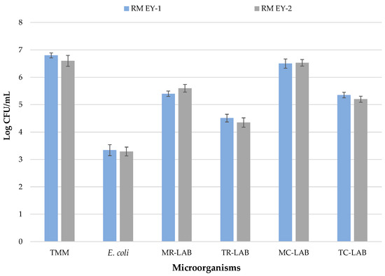Microbiological loads of milk samples before pasteurization. Results indicate mean values and SD of four determinations (carried out in duplicate for two independent productions). Abbreviations: EY-1, production performed with freeze-dried commercial starter culture (starter formulation YODOX91); EY-2, production performed with a multi-strain milk starter culture consisting of S. thermophilus and L. delbrueckii; RM, raw milk; TMM, total mesophilic microorganisms; E., Escherichia; LAB, lactic acid bacteria; MR, mesophilic rod; TR, thermophilic rod; MC, mesophilic cocci; TC, thermophilic cocci.