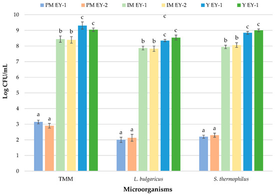 The results of microbiological analyses of raw milk samples from EY-1 and EY-2 productions are shown in Figure 2.