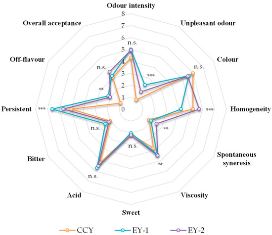 Spider diagram of sensory evaluation of yoghurts. Abbreviations: CCY, commercial cow’s yoghurt; EY-1, production of ewe’s yoghurt performed with freeze-dried commercial starter culture (starter formulation YODOX91); EY-2, production of ewe’s yoghurt performed with a multi-strain milk starter culture consisting of S. thermophilus and L. delbrueckii; ** p < 0.01; *** p < 0.001; n.s., not significant (p > 0.05).