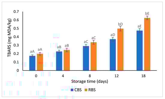 Figure 2. TBARS (mg MDA/kg) values of control and reformulated Bologna sausages at 0, 4, 8, 12, and 18 days of storage at 4 °C. Different lowercase letters indicate significant differences between sausage formulations (p < 0.05) for the same storage period, while different uppercase letters are indicative of significant differences between sampling times for the same sausage formulation (p < 0.05); CBS—control Bologna sausages; RBS—reformulated Bologna sausages.
