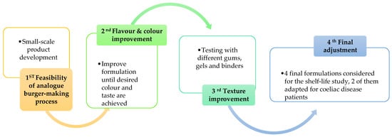 The procedure carried out to develop the burgers was a heuristic methodology based on an iterative process [16]. The results of the process were the starting point for the following tests until a product that met the predefined requirements was attained. Therefore, a test was previously carried out to determine the feasibility of the development of these new products. Once these expectations were met, improvement in the formulation was carried out until an acceptable taste was reached. Then, the texture was worked on. Texture implies a challenge in the production of a meat product from vegetable proteins. Figure 1. shows how the iterative process was developed until 4 final formulations were reached [17].