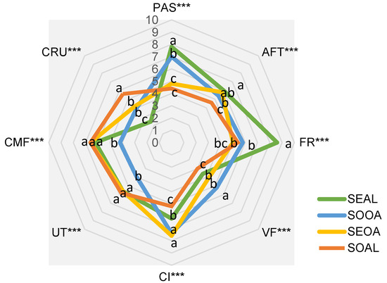 Development of the initial product characterization (spider diagram) on day 1. Shows the characterization of the product as a function of the adjusted mean representation, where the attributes characterizing the treatments are represented, as mentioned above. CRU: Crunchiness; CI: Color Intensity; FR: Fracturability; PAS: Pastiness; VF: Vegetable flavor; AFT: Aftertaste UT: Umami taste; HAR: Hardness; CMF: Cooked meat flavor. Different letters indicate significant differences, *** (p < 0.001).