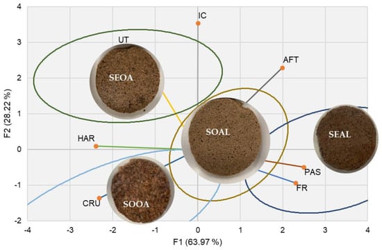 Finally, Figure 3 shows which sensory attribute defined each developed formulation. The SEOA burger stood out for it is umami taste, toughness, and color intensity and was near to the SOOA burger in terms of crunchiness and toughness. The SEAL burger was perceived to be more pasty and fracturable. And as a more neutral evaluation without being characterized by any attribute in general, the SOAL burger was found to be more neutral. Burgers with oats were found to be nearer to each other than those formulated with alginate; nevertheless, the raw material used. Oat is an ingredient that provides more hardness and gives a more intense color to the food.