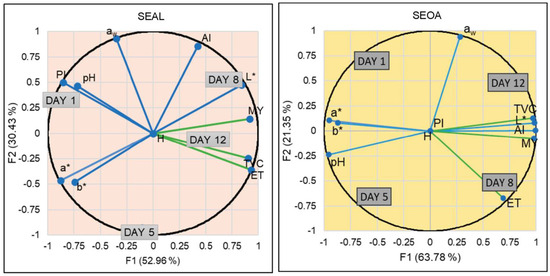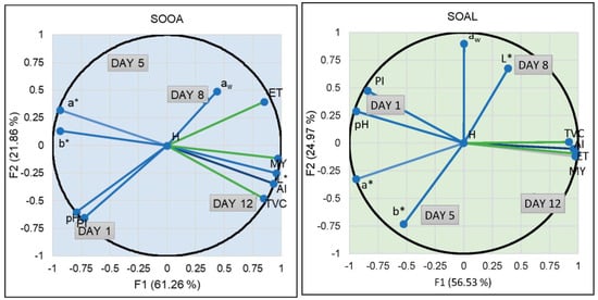 As can be seen in a general view, none of the PCAs showed a trend in linearity over time and all of them were different from each other. This means that the days follow one after the other in chronological order. In the SEAL sample, the variability of the experiment was found to be 83.39% for the two components. Day one was characterized by the physicochemical parameters of PI and pH. Over time, day five was distinguished by the color coordinates (a* and b*) experiencing a higher microbial load. Day 8 was described by AI and L* approached the final day (day 12) with the growth of microorganisms (TVC, MY, and especially ET, with a high ET contribution in the component). However, the sample formulated with seitan and oat (SEOA) behaved differently. The variability of the experiment was found to be 85.13% in the two components. The initial days were mainly characterized by color coordinates and pH. Over time, on day eight, microbial growth was again experienced until the end of its shelf-life, which was related to water activity. The physicochemical parameters such as acid value and lightness were described with the microbial growth, which is related to the higher content of free acids that determine the rancidity reactions. In this formulation, the peroxide value and moisture content were found to be neutral. The PI values were very low, which may be because some of the ingredients have antioxidant capacity. In the SOOA sample, the variability in the two components was 83.13% and again there was a relationship between the initial day with pH and PI. The color parameters (a* and b*) characterized day five, while day eight was defined by water activity, microbial growth, and AI until the end of shelf-life. For the SOAL sample, the variability of the experiment was described as 81.5% in the two components. Day one was again described by PI and pH, as is the case for the other alginate formulation, as shown in Table 2. Day five is described by the coordinates of more weight, a* and b*, in this case, due to a more yellowish coloration. Day eight was defined by water activity and luminescence. At the end of life, AI-related microbial growth began to occur.