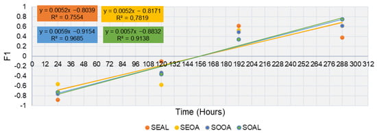 Figure 5 shows the shelf-life using the multivariate approach. It was estimated by plotting the scatter plots from the factorial scores of the first component (F1). These were obtained from the PCA graphics shown in Figure 4 based on the physicochemical and microbiological parameters evaluated. The intersection of the curve with the abscissa should be understood as the time that the product is kept in suitable conditions for consumption. These results estimated that the expiry date of all developed products was set at 156 h, i.e., 7 days. The samples showed no difference. This could be due to the similarities among formulations.