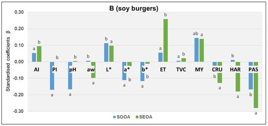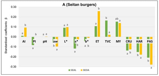 Standardized beta coefficient over time. L*: Luminosity; a* and b*: Color coordinates; ET: Enterobacteriaceae; TVC: Total Viable Counts; MY: Molds and yeasts; aw: Water activity; AI: Acidity index; PI: Peroxide index; H: Moisture; CRU: Crunchiness; HAR: Hardness; PAS: Pastiness. Different letters indicate significant differences (p < 0.05). (A): containing seitan (hamburgers for all the population except coeliacs), (B): containing soya (hamburgers suitable for coeliacs).