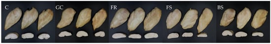 In the cooking loss measurement (Table 2), GC (21.8 ± 1.8%) and FR (23.8 ± 0.9%) exhibited slightly higher values than those of C (24.0 ± 0.2%), FS (24.0 ± 0.0%) and BS (23.3 ± 0.9%) but there was no significant difference observed (p > 0.05). It is considered that the heating processes, i.e., SHS and convection oven, already led to sufficient loss during cooking. This is consistent with the results of Yusop et al. [35], who also demonstrated no significant effect on cooking loss of chicken breast when using different marinade treatments after dry heating and steam cooking for 15 min. Moreover, Augustyńska-Prejsnar et al. [36] indicated no effect on cooking loss when using acidic marinated chicken breasts. Lopez et al. [37] also demonstrated that over 1.0% (v/v) sodium chloride concentration in tenderizers had no significant effect on cooking loss and moisture retention of chicken breast meat.
