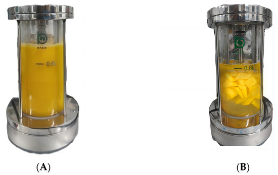 Mango fruits were fermented after beating (juices fermentation, Figure 1A) or cutting into pieces (pieces fermentation, Figure 1B). For juices fermentation, mango fruits were peeled, sliced into pieces, mixed with equal weights of purified water, and handled with a grinding mill (RS-FS1401, Royalstar, Anhui, China), with 6% sucrose and 15% kombucha culture solution added aseptically. For pieces fermentation, mango fruits were peeled and sliced into pieces (3 cm × 2 cm × 0.5 cm) and mixed with an equal weight of purified water. The samples were fermented with a glass fermenter (BIOTECH-1BG-3-5BG, Shanghai Baoxing Bio-Engineering Equipment Co., Ltd., Shanghai, China) at 25 °C for 24 h.