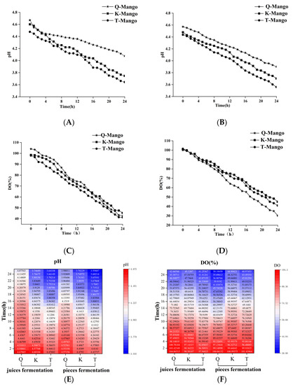 Changes in the pH value and DO concentration of fermentation broth in mango juices fermentation (A,C) and pieces fermentation (B,D). The heatmap (E,F) shows the changing trend in the pH and DO of different types during fermentation. Capital letters Q, K, and T indicate Green Kaew, Keitt, and Tainung mango.