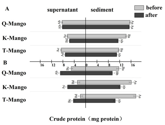 The change in the total protein in the supernatant and sediment of the fermentation broth (A) in juices fermentation and (B) in pieces fermentation. Capital letters indicate the difference of different fermentation types (p < 0.05), and lowercase letters indicate the difference between the same sample before and after fermentation (p < 0.05).