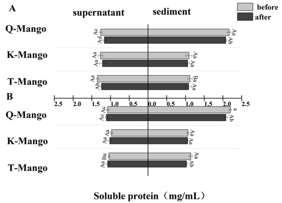 The change in the soluble protein in the supernatant and sediment of the fermentation broth (A) in juices fermentation and (B) in pieces fermentation. Capital letters indicate the difference of different fermentation types (p < 0.05), and lowercase letters indicate the difference between the same sample before and after fermentation (p < 0.05).