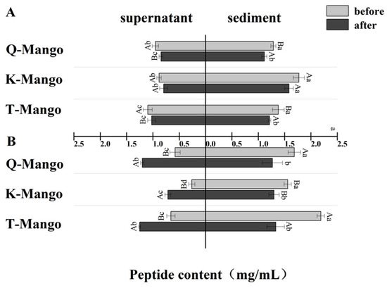 The change in the peptide content in the supernatant and sediment of the fermentation broth (Figure 4) (A) in juices fermentation and (B) in pieces fermentation. Capital letters indicate the difference of different fermentation types (p < 0.05), and lowercase letters indicate the difference between the same sample before and after fermentation (p < 0.05).