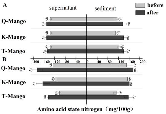 The changes in the amino acid nitrogen content in the supernatant and sediment of the fermentation broth (A) in juices fermentation and (B) in pieces fermentation. Capital letters indicate the difference of different fermentation types (p < 0.05), and lowercase letters indicate the difference between the same sample before and after fermentation (p < 0.05).