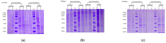 SDS-PAGE pattern of Q-Mango (a), T-Mango (b), and K-Mango (c) before and after fermentation. A = After fermented; B = Before fermented; M = Protein standard; Protein molecular weight markers: 20, 25, 35, 50, 70, 100, and 130 kDa.