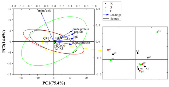 PCA biplots between the crude protein; soluble protein; peptides; amino acid; and IgE reactivity of K-Mango (K), T-Mango (T), and Q-Mango (Q) before and after fermentation. Black, red, and green circles indicate 95% confidence ellipses for K-Mango (K), Q-Mango (Q), and T-Mango (T). K1, Q1, and T1 represent the eigenvalues of the K-Mango, Q-Mango, and T-Mango supernatants obtained from juices fermentation; K2, Q2, and T2 represent the eigenvalues of the K-Mango, Q-Mango, and T-Mango sediments obtained from juices fermentation; K3, Q3, and T3 represent the eigenvalues of the K-Mango, Q-Mango, and T-Mango supernatants obtained from pieces fermentation; and K4, Q4, and T4 represent the eigenvalues of the K-Mango, Q-Mango, and T-Mango sediments obtained from pieces fermentation.