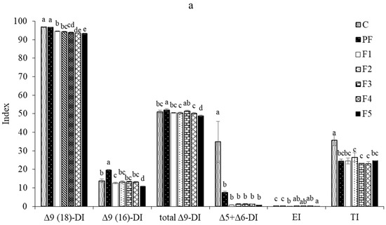 The estimated indices of fatty acid metabolism and Δ6 desaturase (fads2) gene expression are shown in Figure 1. Animals, including insects, do not normally produce essential long-chain fatty acids, i.e., linoleic and α-linolenic acids, from acetyl-CoA [21]. Desaturating, elongating, and terminating enzymes, in particular, have been shown to accelerate the transformation of dietary linoleic and α-linolenic acids to longer-chain PUFAs [20]. The levels of fatty acid metabolism indices and fads2 gene expression were examined to determine the effect of fortification with three PIs in feed on the enzymes involved in the desaturation and elongation of fatty acids in SPWL. The activity of Δ9 desaturase (18) involved in the conversion of stearic acid to oleic (18:1ω9) acid was observed at more than 90%, with the greatest activity found in SPWL fed the control and PF diets (p < 0.05), which was largely associated with the high concentration of n − 9 oleic acid in the corresponding SPWL (Table 4). Furthermore, SPWL fed the PF diet exhibited the greatest Δ9 desaturase (16) activity as well as the greatest total Δ9 desaturase index. Both indexes resulted in the formation of MUFA-rich palmitoleic acid (C16:1) and oleic acid in SPWL (Figure 1a). Feeding the PF and control diets to SPWL accelerated in vivo enzymes catalyzing the biosynthesis of MUFAs by adding a double bond at the ninth position (Δ9 desaturase) from the carboxyl end of fatty acids (Figure 1), resulting in increased oleic acid concentration. Furthermore, the presence of palmitoleic acid was more noticeable. This enzyme encodes a transmembrane fatty acid desaturase that uses saturated homologs to produce palmitoleic and oleic acids, similar to Hermetia illucens [58]. Because of the high sensitivity of the terminal thioesterase (which releases the synthesized fatty acid) to palmitic acid, the fatty acid synthase complex is known to produce large amounts of palmitic acid directly from acetyl-CoA via malonyl-CoA production. Palmitic acid is then extended to produce longer-chain fatty acids (such as stearic acid via the fatty acid elongase 6/ELOVL 6 enzyme), which are desaturated to produce UFAs or used to synthesize storage lipids [58]. The activities of the rate-limiting enzymes, Δ5 + Δ6 desaturases, determine the transformation of linoleic and α-linolenic acids to longer-chain PUFAs [20]. The activities of Δ5 + Δ6 desaturases were dramatically low in all SPWL, with those fed the control diet having the highest activities. The other SPWL did not differ in their Δ5 + Δ6 desaturase activities (p > 0.05), suggesting that the feed ingredient used in this study had no effect on this enzymatic activity. This insect, on the other hand, lacks Δ5 + Δ6 desaturases. Normally, the substrate specificity and catalytic efficiency of fatty acid desaturases from the same genus and even species differ. Linoleic and α-linolenic acids compete for active sites on Δ5 + Δ6 desaturase enzymes when both are present, although their affinities are different [59]. SPWL fed the control diet had the greatest thioesterase activity (p < 0.05), but no difference in thioesterase activity was found among SPWL fed PI-supplemented and PF diets (p > 0.05). Since thioesterase activity was low in all SPWL, fatty acid biosynthesis to longer 18-carbon chains was limited. This was related to the fatty acid profile of SPWL (Table 5).