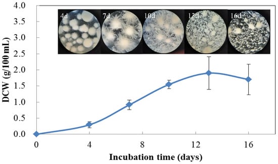 To ensure the edibility of mushrooms, their suitability for public consumption, and the possibility of cultivation within the region, our research team selected ten strains of mushrooms from local supermarkets in Taiwan for evaluation. Their isolated mycelia were cultured on PDA plates for 5 days. Based on the size of the hyphal circle (Figure S1), the fastest-growing fungus was selected. Its two ITS sequences (NCBI accession numbers: OR512537 and OR512538) indicated that this dikaryotic mycelium contains two different haploid forms and was preliminarily identified as Pleurotus sp. (Figure S2). The mycelial growth results for different periods based on base-submerged culture conditions are shown in Figure 1. The DCW was in a straight line within 10 days and peaked at approximately 13 days. However, the appearance of the mycelial pellets changed from intact granular to burr-like, and they finally disintegrated into different sizes. The reasons for the fragmentation of mycelial particles are presumed to be low dissolved oxygen due to poor media rheology [], the autolysis phenomenon [], or friction due to a lack of space for high-cell-density cultivation. Therefore, 7 days was used under the following cultural conditions: