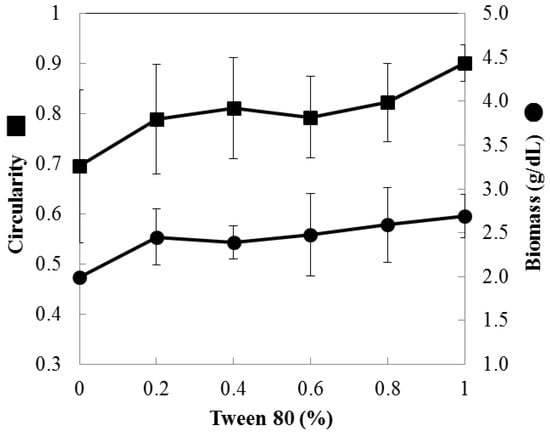 The effects of Tween 80 on circularity and biomass. Mycelial pellets were cultured in optimized formulation (A2B3C3D3) with different concentrations of Tween 80.