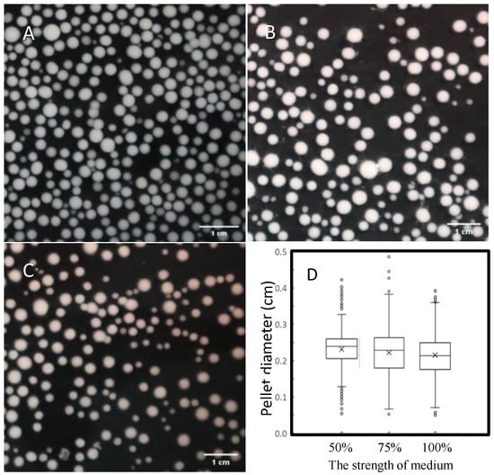The effect of medium strength on pellet diameter. To accurately calculate the particle size and avoid particle overlap, the pellets cultivated in different medium strengths ((A): 50%, (B): 75%, and (C): 100%) were diluted appropriately, photographed, 444–519 particles were analyzed by the ImageJ and calculated as a box plot (D). The five-number summary is the minimum, first quartile, median, third quartile, and maximum. X indicates the average value and circles (○) for outlier data, determined by points lying further than 1.5-fold the interquartile range from the edge of the box.