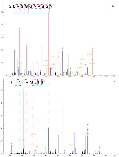 MS/MS spectra of identified peptides GLPSGGAPSGY (A), ITPPVMLPP (B).
