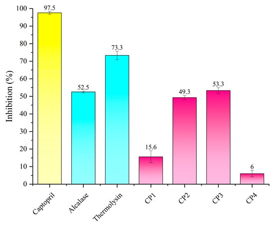 Thermolysin was the enzyme yielding peptides with the higher ACE inhibitory capacity, and the hydrolysate of alcalase also had considerable ACE inhibitory activity, according to results. Generally, the antihypertensive peptides contained between 2 and 12 amino acids, and presented a certain amount of hydrophobic residues [,]. Compared with captopril, the ACE inhibition rate of thermolysin hydrolysate reached 73.3%, indicating that there are very promising inhibitors among them, and these inhibitors are completely safe without any side effects.