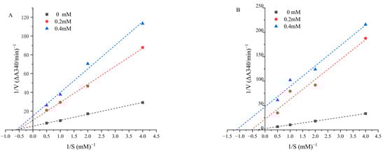 Referring to the methods in the literature, and combined with the above in vitro activity assay results, the design of the inhibition pattern test is as follows: various concentrations (0, 0.2, 0.4 mM) of ACE inhibitory peptides were added to each reaction system; meanwhile, the concentration of FAPGG were set as 0.25, 0.5, 1, 2 mM. According to the Michaelis–Menten kinetic equation, the Michaelis–Menten constant (Km) and the maximum reaction rate (Vmax) were calculated from the Lineweaver–Burk plot to determine the inhibition pattern of peptides. All evaluations were performed in triplicate.