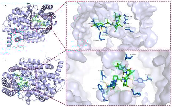 Molecular docking of bioactive peptides binding on receptor protein: (A) 3D illustration of the interaction between CP2 and ACE; (B) 3D illustration of the interaction between CP3 and ACE.