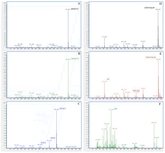 (A) Mass spectrum of CP2; (B) Mass spectrum of CP2 digested by pepsin; (C) Mass spectrum of CP2 digested by pepsin-pancreatin; (D) Mass spectrum of CP3; (E) Mass spectrum of CP3 digested by pepsin; (F) Mass spectrum of CP3 digested by pepsin-pancreatin.