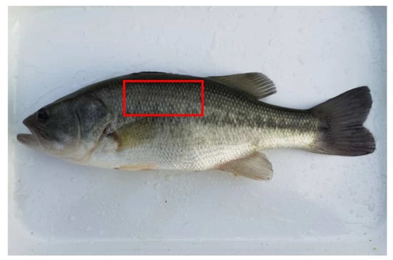 Samples were collected 68 days after the initiation of the culture experiment. A pre-sampling fasting period of one day facilitated the emptying process of the largemouth bass intestines. All caged largemouth bass were weighed. Largemouth bass were anesthetized using MS-222 before sampling. Subsequently, each fish was weighed individually. Nine of them were collected from each cage for blood and back muscle. Back muscle texture parameters were immediately identified. Sample sections were fixed using 5% paraformaldehyde. Plasma was collected after blood centrifugation. The remaining samples were cryopreserved using liquid nitrogen and subsequently stored at −80 °C. The sampling site for largemouth bass back muscle is shown in Figure 1.
