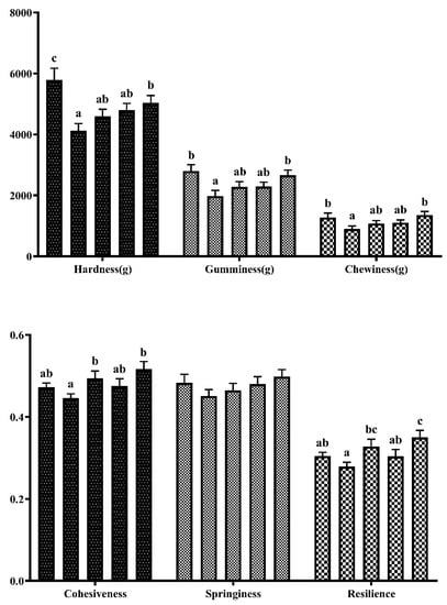 Back muscle texture of largemouth bass. abc Different groups with significant differences are represented by different letters, different groups without significant differences are represented by the same letter, and no letter means that there is no significant difference between all groups.