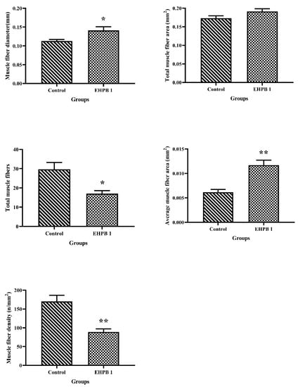 Figure 3 and Figure 4 depict the results of largemouth bass back muscle slicing. The EHPB1 group showed significant increases in the diameter and average area of the back muscle fibers (p < 0.05), with significant decreases in the total number and density of muscle fibers (p < 0.05). Furthermore, the EHPB1 group exhibited a slight increase in the total back muscle area.