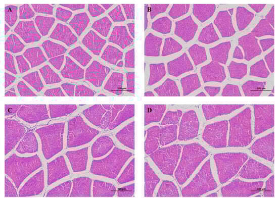 Muscles of aquatic animals serve as the primary protein source in aquaculture. Muscle quality determines the success of aquatic products to some extent. The muscle quality of aquatic animals is influenced by various factors, including the growth stage [], feed composition [], culture pattern [], and aquaculture environmental factors []. Biochemical processes during muscle-to-meat conversion significantly affect the quality of fresh muscle. These modifications affect various distinct characteristics of muscle, including appearance, nutritional composition, and texture. Therefore, modifying the muscle fiber characteristics of living animals may be a viable approach for regulating fresh muscle quality []. Recent studies have demonstrated that substitution of dietary protein sources can affect the muscle quality of various aquatic species, such as mirror carp (Cyprinus carpio) [], tilapia (Oreochromis niloticus) [], and largemouth bass (Micropterus salmoides) []. In addition, animal protein sources, particularly poultry by-products, can improve the muscle quality of aquatic animals, including protein and fatty acid content and chewability [,]. In the context of fishmeal replacement, there is still a lack of understanding of the influence of various new protein sources on the muscle quality of aquatic products. Currently, research on the effects of EHPB as a feed protein source on the muscle quality of aquatic animals is limited. Moreover, the effect of EHPB on the muscle quality of largemouth bass remains unclear. Therefore, there is a pressing need to investigate the effect of EHPB as a potential replacement for fishmeal in largemouth bass.