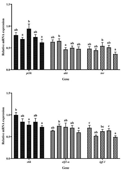 Expression of genes involved in protein synthesis in largemouth bass. abc Different groups with significant differences are represented by different letters, different groups without significant differences are represented by the same letter, and no letter means that there is no significant difference between all groups.