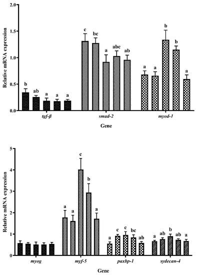 Expression of genes involved in muscle production. abc Different groups with significant differences are represented by different letters, different groups without significant differences are represented by the same letter, and no letter means that there is no significant difference between all groups.