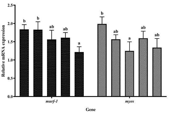The expression of genes related to muscle atrophy in largemouth bass. ab Different groups with significant differences are represented by different letters, different groups without significant differences are represented by the same letter, and no letter means that there is no significant difference between all groups.