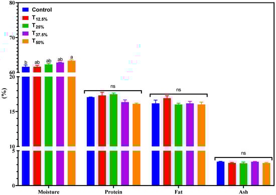 Chemical composition (%) of canned pâtés with replacement of pork meat using isolated pea protein. Different letters indicate significant differences based on Tukey’s test (p < 0.05). Error bars depict the standard error of the average. Batches—control: 100% pork meat; reformulated pâtés: substitution of 12.5% (T12.5%), 25% (T25%), 37.5% (T37.5%), and 50% (T50%) of pork meat with pre-hydrated isolated pea protein (1:3). ns: not significant.